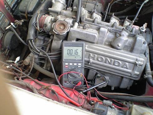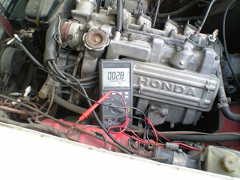 今回問題な点はただ一つ。 ・点火系統の火花がまったく飛ばない事 ですので、先日の図面どおりに各部の導通があるかどうかをメインにチェックしていきます。 1.バッテリー+からキーシリンダ、レジスタ端子まで キーをONにした状態ではバッテリ+とレジスタまでの回路へ電気が流れ、レジスターからコイルへ入り、火花を飛ばす準備ができる事になります。 キースイッチがON状態で1の経路は抵抗値こそ高いものの、導通があるので問題がないと見ていいと思います。 次にイグニッションコイルに接続されるレジスタの焼損を疑います。 導通もあり、一定の抵抗値を示しています。 Spec:1.4ohmに対して1.6ohmですから問題ないと思います。 次にイグニッションコイルを疑います。