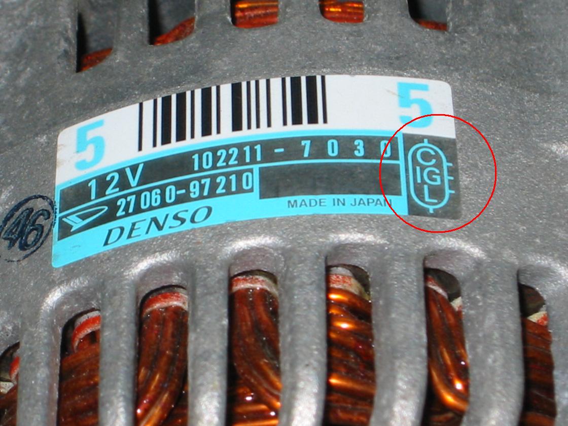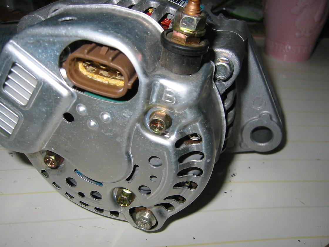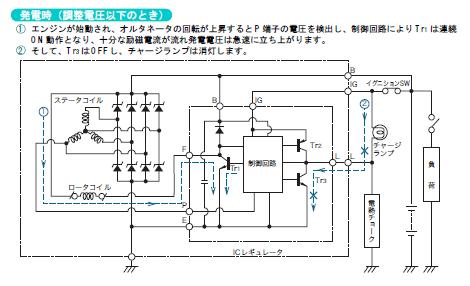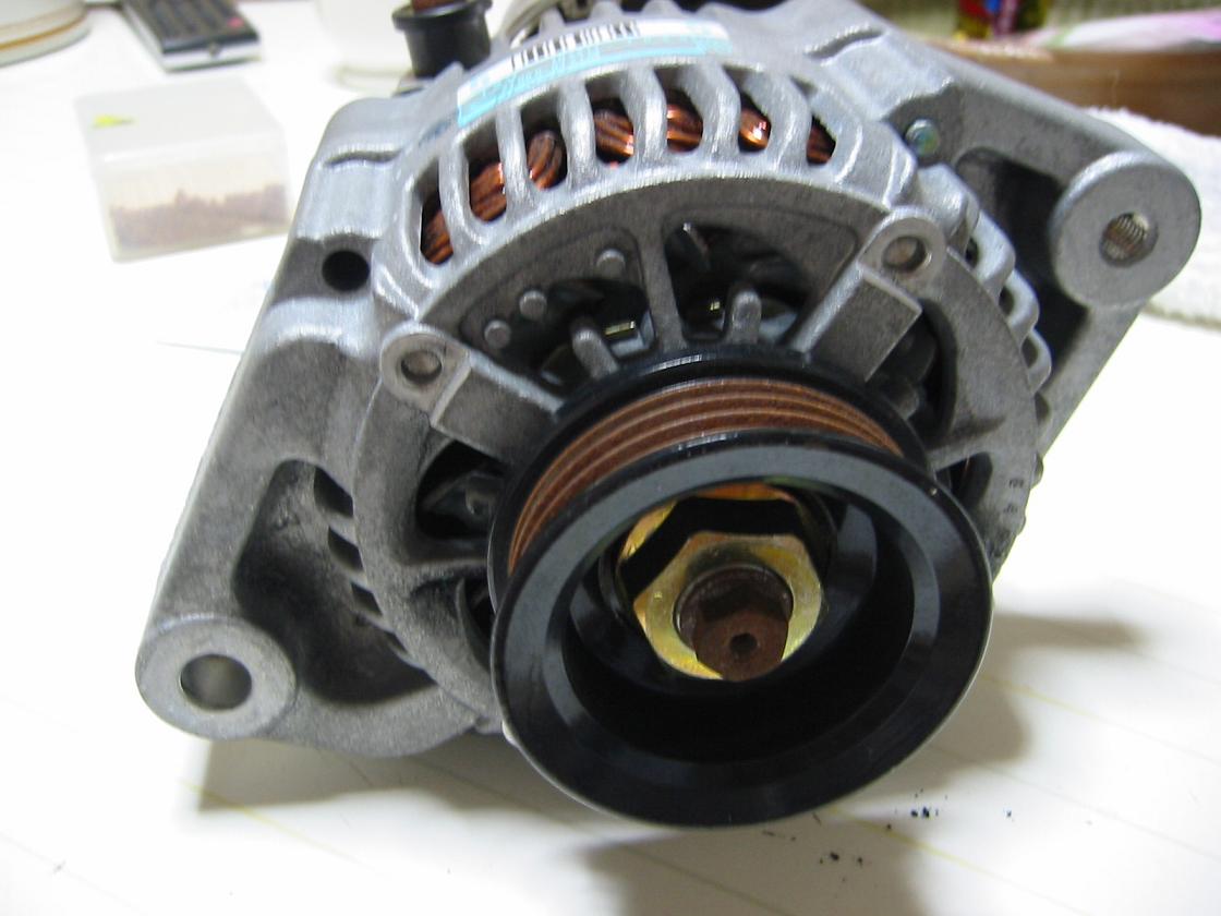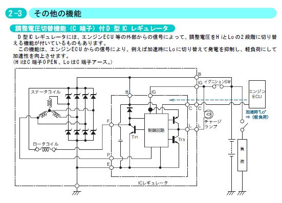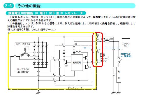 こんな日は電気回路をやるのが一番です。 発電量にかなりの問題を抱えたうちのエスロクですが、容量アップを狙って最新軽自動車のオルタネータへのスワップを行おうと目論んでいます。 最新軽自動車にはデフォッガやらエアコンがついていますので容量やエンジンに掛かる負荷を考えればベストなソリューションです。 なにしろ、何も考えずともアイドリングでも安定して充電するのがICレギュレータビルトインのオルタネータの最大の特徴です。(発電容量も大きい) 取り付け時に問題となる項目をリストアップします。 ・マウント位置のオフセット角 ・ICレギュレータビルトインのオルタネータを取り付けるのでチリル式の レギュレータの取り外しと再配線 ・オルタネータの結線確認・コネクタ形状 次に必要なもののリストアップをします。 ・中古の程度のよいICビルトインオルタネータ ・ハーネス・カプラ等の線材・インシュレーター等 ・アルミパイプ さらにエスではオルタのプーリーでラジエータファンを駆動しますが、新しいオルタネータではオフセットが変わるのとプーリーが使えないのでファンが使えません。 ですので下記のものが追加で必要になります。 ・電動ラジエータファン(S600/S800へのポン付けのものがスプレッドツールさんの所で売っています(34650円) ・サーモスイッチ 電動ファンは単品では廻りっ放しになってしまうので、冬場はオーバークールになってしまいます。そこでサーモスイッチが必要になります。 サーモスイッチはセンサの感温温度に応じてスイッチがON/OFFに切り替わるスイッチで サーミスタ型とバイメタル型など数種類あります。 固定値でON/OFFが切り替わるタイプと可変抵抗でON/OFF温度を変えられるタイプの 2種類あります。これはOT誌でおなじみのビルダーズハウスさんがヤフオクで取り扱い製品を販売しています。(5890円) さらに、ICレギュレータビルトインタイプの最近のオルタを流用する場合は出力コネクタがこのような特殊なものを使用していますのでこのためのカプラを用意する必要が出てきます。 プーリーも最近のものはリブベルトでVベルトではないのでそのままでは付きません。 リブベルトものの場合はさらにプーリーの交換も必要です。 これはダイハツのタントという軽(L350)の中古オルタですが、軽自動車用としては新目ののC端子が付いている最新型です。この端子に関しては後述。 換装用の選定基準は走行距離の少ない程度のよいものを探します。 ヤフオクではコンスタントに安くてよいものが出ていますので探しましょう。 特にポイントはブラシやベアリングの傷みの少ない事故車引き上げ物を狙うのがポイントです。 リビルドオルタを出品している業者のものはコア引き取りが前提ですからこういったものに手を出してはいけません(笑)高いうえにコア代までを請求されます。 私が買ったタントのオルタはVベルトプーリーではないのでプーリーの交換が必要になります。そこで2コイチをやります。同じメーカのオルタならば年式が近い場合はポン付けで交換できます。 プーリーですが、過走行車のL200ミラのオルタあたりが1000円前後でコンスタントに出品されています。このL200系ではVベルトを使用していますから、いいかもしれません。オルタがまともだった場合は端子も(L端子とIG端子のカプラ)+B端子の3結線で済み、配線も簡単です。 オルタと接続するカプラですが、運良くヤフオクで売ってました。ちょっと高いですが(1050円)ショートの危険なく結線できますので1個買っておくといいでしょう。 もっとも、手に入りそうもなかったので私はエーモンのスピーカー用端子を使う気でした。一応紹介します。 コード類は入手性からエーモンでよいでしょう。 B端子は大電流が流れますので8Sq.程度のアーシングケーブルなどを加工して使います。 それ以外は大きな電流は流れませんから、通常の細いハーネスで十分です。 エスロク用電動ファンがスプレッドツールから届きました。 こやつは大飯喰らいなのでオルタスワップをしないとバッテリの容量を気にしながらちまちま走るといった何とも精神衛生上宜しくない事態になります(w 特にサーモセンサで制御せず、常時ONで使用する場合はバッテリに負荷が掛かることとになります。 ここでまず、オルタネータ素人の私が付け焼き刃の知識をつけるために(笑) オルタの種類を確認します。デンソー東京のページに親切な解説ページがあります。 ICレギュレータビルトインのものにはいくつか種類があり、出力ピンの名称でおおよそ大別できます。 そしてその判別方法は意外と簡単です。 このマークが示すピンアサイン(出力端子の機能割り当て)によって大別できます。 オルタネータ上部にある大きな端子がB端子、カプラ内にIG端子、L端子、C端子となります。ちょっと古い軽のオルタだとカプラはL字状の2端子カプラになり、IGとL端子のものが多くなります。(ダイハツの場合) そしてタントのオルタは下