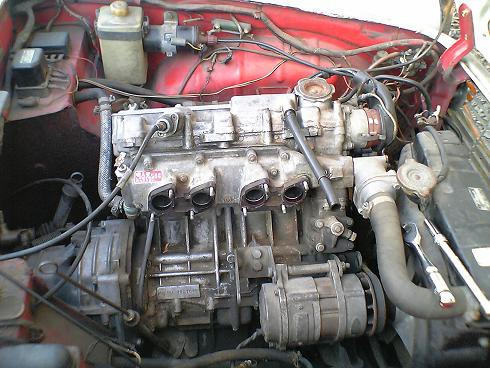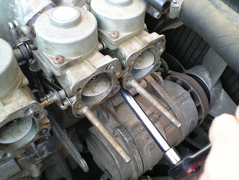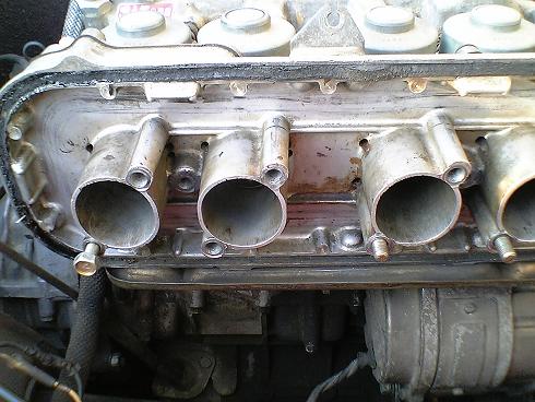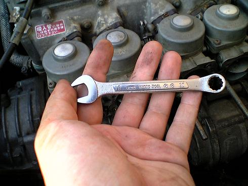 先々週にもぎ取りスペアのキャブレター洗浄を載せましたが、 これは正真正銘、車体付属のついこの前まで実働していたキャブですが・・・ 純正と何が違うかお判りの方も多いはず。そう、ボルトの形状とサイズが違います。しかもこのボルトは純正よりも径が大きいようです。 ねじ山もナメ気味なのかしっかりと締まっていません。 しかも右側のキャブにいたっては、あるはずのない現代的なスタッドボルトが出ています。 ブリーザーバスを外してみると・・・ びっくりですねぇー、右と左でボルトの締結方法と径が異なります。 きっとこんな状態だけで済むとも思えないので、どんどんバラします。 エンジンを下ろさずにキャブを下ろす方法としては、 1.インマニごとはずす。(マニュアル指示) 2.インマニとキャブを止めるボルトを外してキャブだけ取り外す。 この2式ですが、インマニを外すにはラジエタークーラント(冷却水)を抜かなければならないのと、ガスケット再製作の仕事になるので、迷わず2番をトライです。 しかし下段のボルトはソケットやT字レンチが入っていきませんからこれを使います。 10mmコンビレンチ 全長が短いので簡単に廻す事が出来ます。(左側のみ) さて右側はどうするかというと、狭くてレンチが入らないので10mmボックスにエクステンションを取り付けてみる事にします。 入りましたが、ちょっとオフセットしていますから危険です。 固着でない緩め位なら行けそうですが締めるときは別の手段が必要です。 T字などは入りませんでした。 このヘンテコなボルトに構っていると夜中になってしまうので速やかにマニホールドからキャブを離脱させます。 この前にスロットルワイヤー・チョークワイヤ、ブリーザーチューブ・燃料ホースをそれぞれキャブ・ブリーザーパスから分離させておきます。 ここでもう一つ見たくない新発見。 マニュアルではキャブのボディの自重を支えるためのテンショナーがあることが明記されていますがそのようなものがこの車にはありませんでした。丸の部分がステイの固定ボルト部分。 このステイを付けないと最悪の場合、キャブの自重と振動衝撃でマニホールドにクラックが入る模様。実際もぎ取りしてきたキャブについていたインマニはクラックを修正した溶接痕がありました。 キャブとブリーザーパスは自重がかなりあり、とても重いのでそのまま運用するのは危険だと思います。 ステイはDIYショップ(いわゆるホームセンターですな)で板金を設えてみる予定。 PR